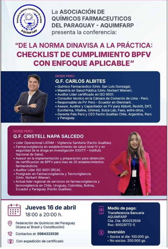 En el marco de la planificación académica de la Asociación de Químicos Farmacéuticos del Paraguay (AQUIMFARP), se anuncia la realización de la conferencia presencial denominada “De la norma DINAVISA a la práctica: checklist de cumplimiento BPFV con enfoque aplicable”, prevista para el día 16 de abril de 2026 en la sede de la Federación de Químicos del Paraguay, en el horario de 18:00 a 20:00 horas.